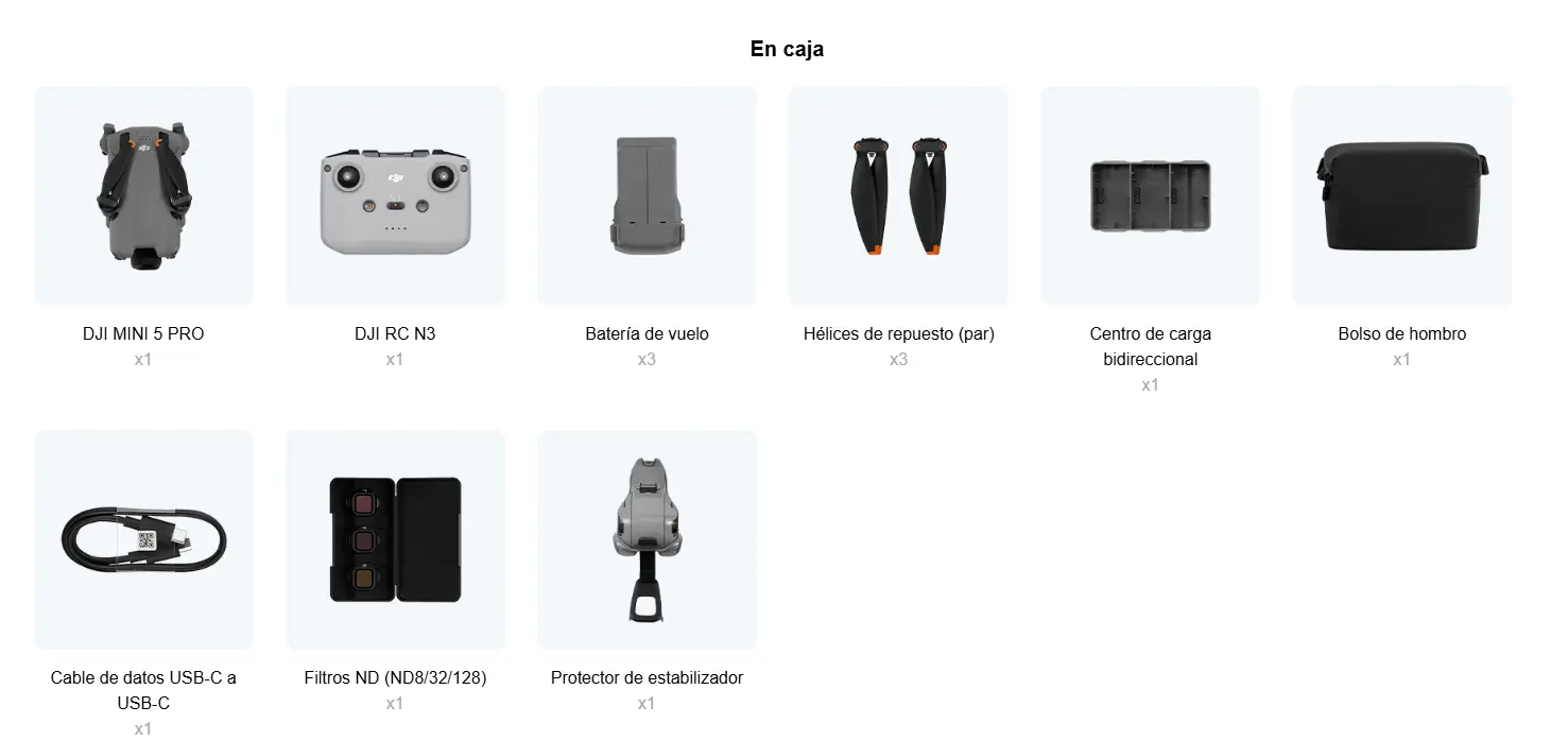 El DJI Mini 5 Pro es un drone compacto y ligero, diseñado para ofrecer gran calidad en foto y video sin necesidad de registro en muchos países (pesa menos de 249 g). Cuenta con una cámara de 48 MP y grabación en 4K a 60 fps, además de un sensor CMOS de 1/1.3" que mejora el rendimiento en condiciones de poca luz. Su autonomía alcanza hasta 45 minutos y dispone de detección de obstáculos tridireccional, garantizando vuelos más seguros. Ideal para creadores de contenido, viajeros y usuarios que buscan portabilidad sin sacrificar calidad profesional.